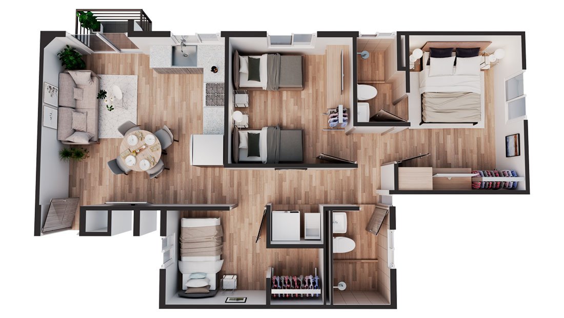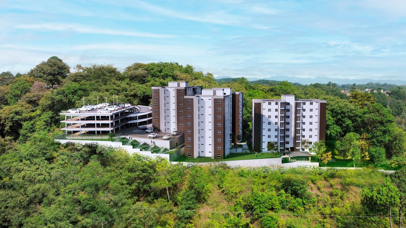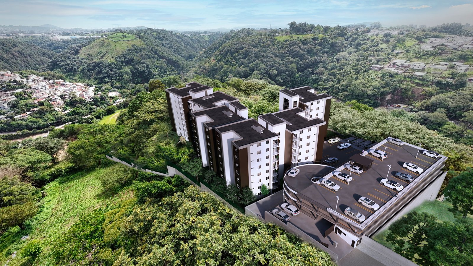 Únicamente 2 torres simples de 2 apartamentos por nivel y 2 torres dobles de 4 apartamentos por nivel, cada apartamento con 3 habitaciones, 2 baños completos y un parqueo.